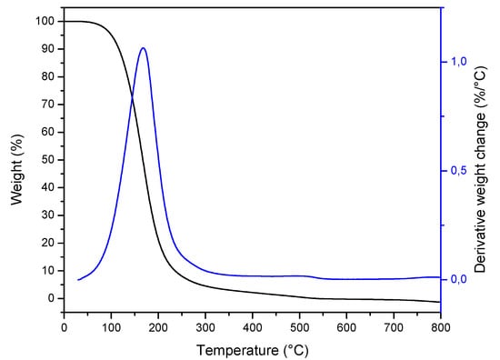 TGA curves of ZEO are shown in Figure 3. The results indicated that the thermal behavior of Zuccagnia punctata is simple and present only one thermal process. A continuous weight loss starting at 62.6 °C and continued until 358.2 °C. These values indicate that ZEO decomposition with temperature begins above room temperature, and therefore it is stable at the temperature of use of ZEOP matrices.