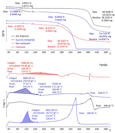 Coupled TGA/DSC analysis was further performed on the as-received products of the micro-scale runs (Figure 5; neat reactants are first shown for comparison). Accordingly, α-(1,3) glucan (black line/DSC) shows no melting peak except a very broad one assigned to the inherent humidity, while the neat succinic anhydride (blue line) shows an intense melting endotherm at 128.43 °C.