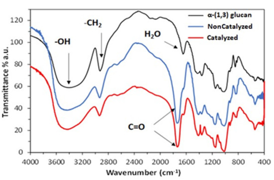 Turning to pH characterization, the pH value of the neat α-(1,3) glucan was compared to that of the modified grades. Glucan provides a basic pH of 7.7, compared to the slightly acidic 4.4 of both the noncatalyzed and catalyzed grades. Obviously, this is due to the dissociation of the new carboxyl groups formed.