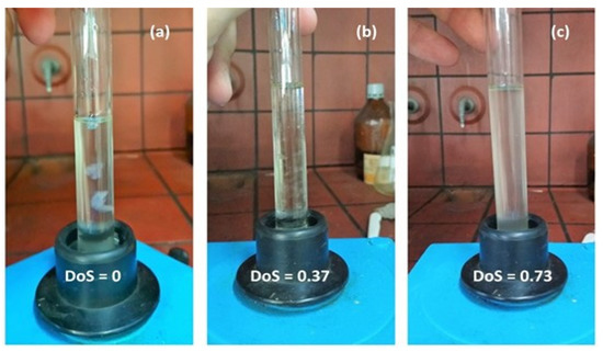Last but not least, it is worthwhile mentioning that solution viscosity measurements were not possible since the products remained insoluble in DSMO/LiCl, once again proving acylation. In particular, solubility trials with pure DMSO were attempted (Figure 8). In these trials, neat glucan was not dissolved but became aggregated and swollen (Figure 8a), while the noncatalyzed sample (Figure 8b) exhibited a different behavior of separate small particles in suspension. Finally, the catalyzed sample (Figure 8c) was almost soluble in DMSO, proving the successful acylation by completely altering the solubility behavior.