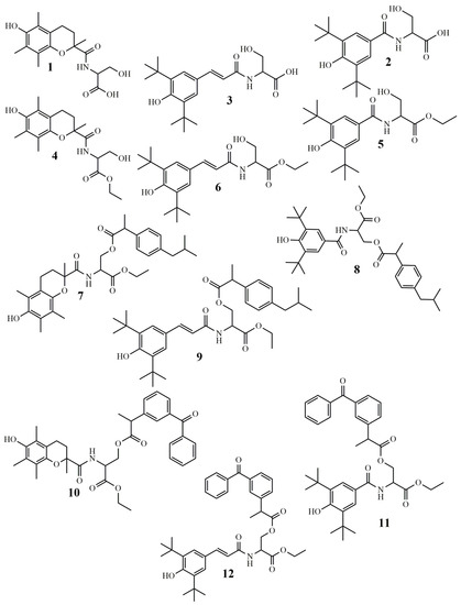 Compounds 4–6 were synthesized by direct amidation of L-serine hydrochloride with the respective acid (R1-COOH, R2-COOH and R3-COOH), via the formation of anhydride with DCC (N,N′-dicyclohexyl-carbodiimide) or the intermediate imidazole derivative using CDI (carbonyldiimidazole), with excellent yields (82–91%). In the case of Trolox (R1COOH), usage of DCC resulted in a bulky intermediate anhydride, leading to lower yields. The corresponding products were hydrolyzed with sodium hydroxide, yielding compounds 1–3, or esterified with ibuprofen (R4-COOH) and ketoprofen (R5-COOH), yielding compounds 7–9 and 10–12, respectively. The esterification reaction was carried out using DCC and DMAP with yields varying from 70 to 91%. In total, the lower yield was obtained with the Trolox derivatives, possibly due to steric hindrance.