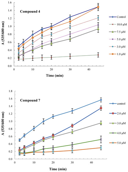 Time course of lipid peroxidation as affected by various concentrations of compounds 4 and 7.