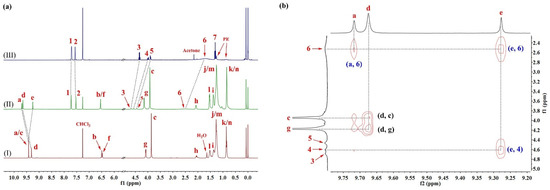 (a) Partial 1H NMR spectra (400 MHz, CDCl3, 298 K) of (I) 1a (2.0 mM), (II) 1a⊃L1 (2.0 mM for each) and (III) L1 (2.0 mM). (b) Expanded 2D NOESY spectrum (600 MHz, CDCl3, 298 K, mixing time = 0.4 s) of 1a⊃L1 (10 mM for each).