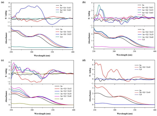 The CD and corresponding UV–vis spectra were recorded on a Jasco model J-1500 spectrometer (JASCO Corporation, Tokyo, Japan) with a scan speed of 200 nm/min, a data pitch of 0.1 nm, a bandwidth of 2 nm and optical path length cells of 10 mm and 1 mm. All spectra were averaged over four measurements. Taking 1a⊃L1 as an example, the CD and UV–vis spectra of 2 mL of 25 µM 1a in CHCl3 were measured with the sequential addition of a 10 mM L1 solution. The guest was added to a CHCl3 solution of 1a (25 μM), in order to keep the concentration of the host 1a solution almost constant.