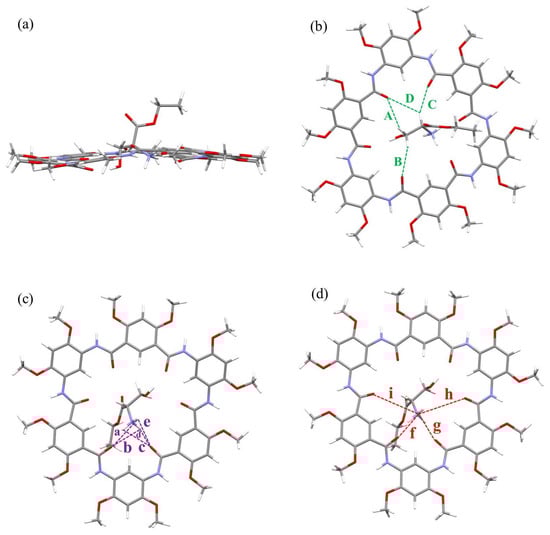 Side view (a) and top views (b–d) of optimized geometry of complex 1b⊃L1 at the B3LYP/6-311G (d, p) level (gray = C, white = H, red = O and blue = N). All side chains have been replaced by methyl groups for simplicity, and the counterion tetrakis (3,5-bis(trifluoromethyl)phenyl) borate anion (BArF−) is omitted for clarity. The green dashed lines indicate C-H∙∙∙O hydrogen bonds A–D, where A = 2.851 Å (121.95°), B = 2.628 Å (140.95°), C = 2.446 Å (145.52°), D = 3.108 Å (123.54°). The purple dashed lines indicate N-H∙∙∙O hydrogen bonds a–e, where a = 3.274 Å (52.99°), b = 3.058 Å (64.77°), c = 3.047 Å (68.12°), d = 1.862 Å (154.20°), e = 3.241 Å (57.73°). The red dashed lines indicate N+∙∙∙O cation–dipole interactions f–i, where f = 2.779 Å, g = 2.829 Å, h = 4.554 Å and i = 4.151 Å.