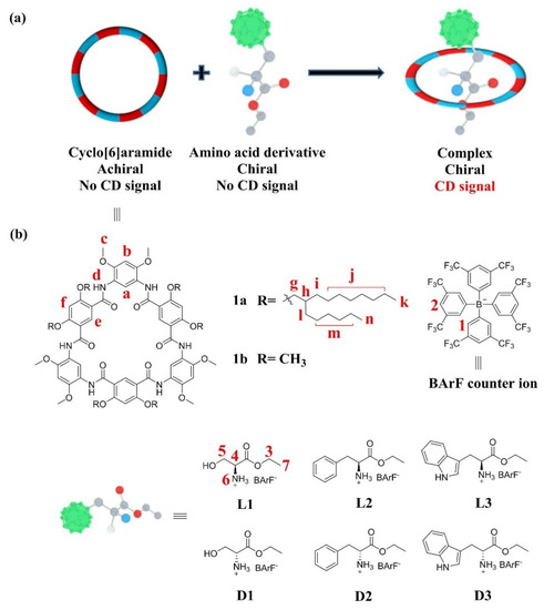 Hydrogen-bonded oligoamide macrocycles [30,31,32] display plenty of interesting H–G behaviors in supramolecular chemistry, as indicated by their uses in recognition [33,34,35], extraction [36], separation [37], transmembrane channels [38], catalysis [39,40] and liquid-crystal materials [41]. Among them, cyclo[6]aramide, a type of hydrogen-bonded amide macrocycle, is particularly noteworthy for the host–guest interactions it demonstrates. This class of macrocycles has a near-planar conformation, containing a cavity decorated with six carbonyl oxygen atoms as binding sites. The electron-rich cavity endows it with a rich H–G chemistry, involving a variety of cationic guest molecules such as dialkylammonium [42], diquat [43], tropylium [44], paraquat [45,46], ferrocenium [47] and pyridinium [48]. We report here that the hydrogen-bonded amide macrocycle host–guest complexation induced chiroptical amplification using cyclo[6]aramide (Scheme 1). The CD responses were found to vary significantly, depending on the side groups of the amino acid guests. The approach proposed in the present study generated a pronounced enantiomeric and structural differentiation of α-amino esters when combined with a macrocyclic host. To the best of our knowledge, this represents the first time a hydrogen-bonded macrocycle has been used as a host for sensing the chirality of α-amino acid derivatives.
