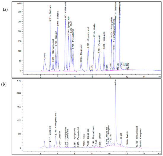 HPLC chromatogram of (a) standard polyphenols compounds and (b) the different polyphenolic components of aqueous olive leaf (AOL) extract. Conditions: At a flow rate of 1 mL/min, the mobile phase consisted of (A) water and (B) 0.02% trifluoroacetic acid in acetonitrile. Phase (A) was adjusted stepwise as follows: 0 min (80%), 0–5 min (80%), 5–8 min (40%), 8–12 min (50%), and 12–14 min (80%), followed by monitoring at 280 nm. Approximately 10 µL of each sample solution was injected, and the column temperature was maintained at 35 °C. Retention times are indicated above each peak.