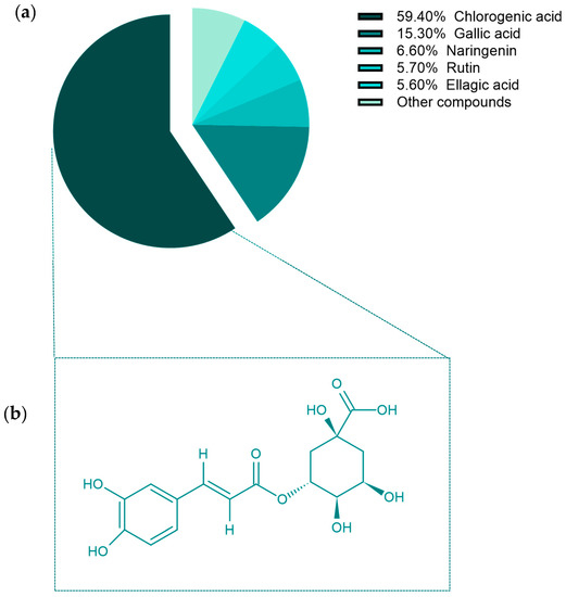 (a) Percentage of total polyphenols, and (b) Chemical structures of chlorogenic acid.