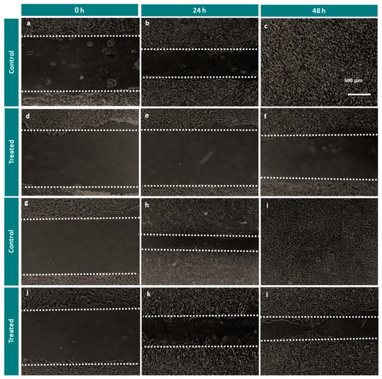 We evaluated cell migration by a wounding healing assay. HT29 and PC3 cell lines were treated with AOL extract at a concentration of 200 g/mL. At 24, 48, and 72 h after treatment, both the cell lines demonstrated a similar reduction in migration, as evidenced by a lower wound-healing rate than that for control cells (Figure 5a–l and Figure 6a,b). At 0 h, no significant cell migration was detected in any for the treated cell lines, as shown in Figure 4; however, control cells for both the cell lines showed complete wound healing after 72 h. As shown in Figure 6c, at 24, and 48 h post-treatment, cell migration was significantly lower for HT29 than for PC3 cells (p < 0.001).