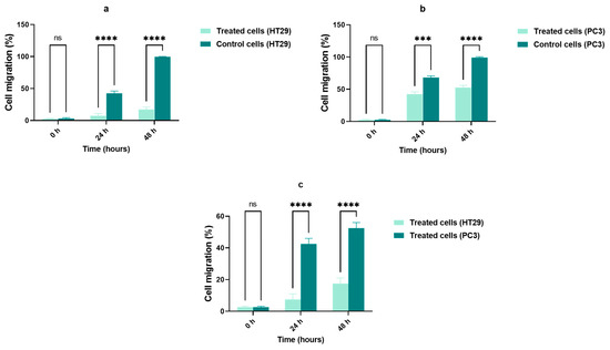 Summary of results for the wound-healing assay. Values are presented as the means ± SDs of three independent replicates and were analyzed by two-way ANOVA and multiple comparison tests. (a) HT29 cells treated with aqueous olive leaf (AOL) extracts vs. control (untreated cells), (b) PC3 cells treated with AOL extracts vs. control (untreated cells), (c) HT29 cells treated with AOL extracts vs. PC3 cells treated with AOL extracts. ns: p > 0.05, ∗∗∗ p < 0.001, ∗∗∗∗ p < 0.0001.