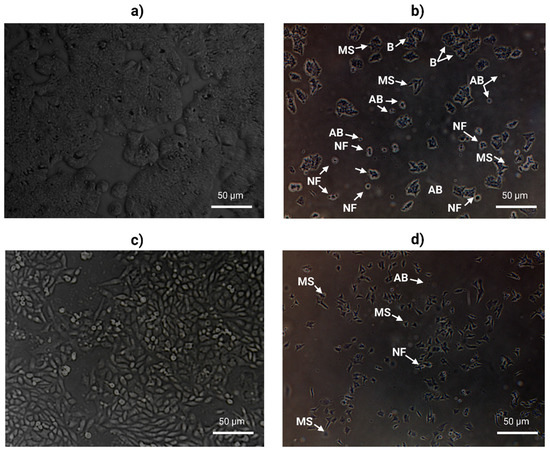 Morphological changes in HT29 and PC3 cells treated with aqueous olive leaf (AOL) extract. Cells were treated with AOL extract at their optimum IC50 for 48 h. (a,b) HT29, (c,d) PC3 cells. Apoptotic hallmark represented as: (B) Blebs, (MS) microtubule spikes, (NF) nuclear fragmentation, and (AB) apoptotic bodies.