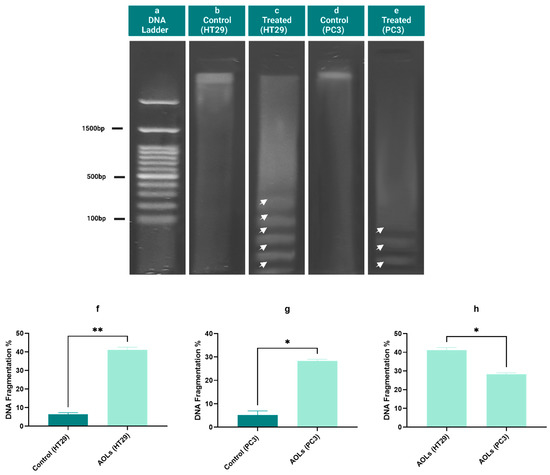 Nuclear DNA is degraded via nuclear endonucleases, and this is considered a hallmark of apoptotic cell death. A DNA fragmentation assay was used to evaluate the effects of AOL extract on cell number and cell morphology in both the cell lines. DNA fragments were detected by comparing DNA profiles by agarose gel electrophoresis, showing a ladder pattern (Figure 8). DNA fragmentation was calculated as a percentage, and the results are presented in Figure 5f–h. Treated HT29 and PC3 cells showed significantly higher rates of DNA fragmentation (p < 0.01, p < 0.05, respectively) than those in untreated cells (Figure 8f–g). However, DNA fragmentation was more prominent in HT29 cells treated with AOL extract than in PC3 cells treated with the same extract (p < 0.05) (Figure 5h).