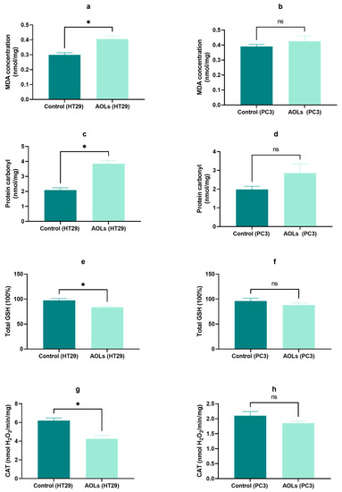Additionally, we observed an increase in the level of protein carbonyls in HT29 cells (p < 0.05), whereas this increase was not significant in PC3 cells treated with AOL extract as compared to control cells (Figure 10c,d). This result indicates that AOL extract accelerated the oxidation of proteins in HT29.