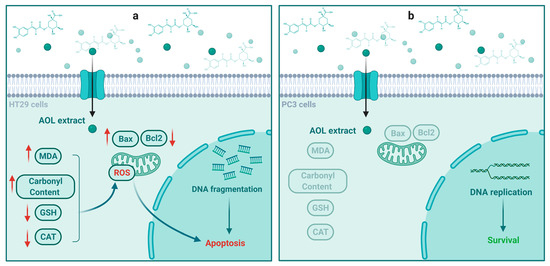 Molecular mechanism suggested for aqueous olive leaf (AOL) extract in triggering apoptosis in (a) HT29 and (b) PC3 cancer cells.