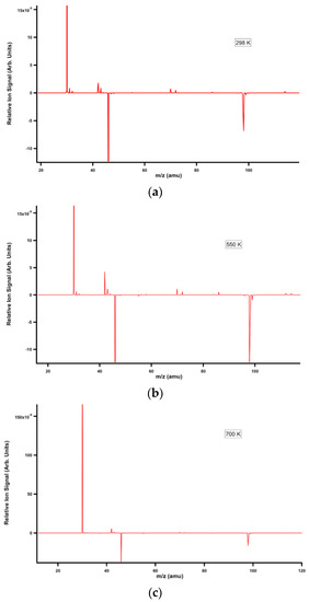 In the AAL + O(3P) reaction, the primary products formed at m/z 42, 44, 70, 72, and 114 at 298 and 550 K, in addition to m/z 86 at 550 K, m/z 42, 44, 70, 72, and 86 at 700 K. The photoionization mass spectra at the three temperatures are presented in Figure 1. The reactant showed a negative ion signal corresponding to a depleting species, and the products presented positive ion signals corresponding to species formation. By photolyzing NO2 to produce O(3P), NO formed at m/z 30. Its experimental photoionization (PI) spectrum matched with the literature PI spectrum of NO [46]. Figure 2 shows the PI curve of m/z 30 at 550 K.