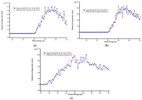 Literature PI spectra of ketene superimposed onto the experimental PI spectra of m/z 42 at (a) 298 K (b) 550 K, and (c) 700 K.