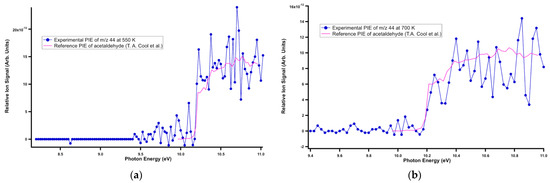 Reference PI spectrum of acetaldehyde superimposed onto the experimental PI spectrum at m/z 44 at (a) 550 K and (b) 700 K.