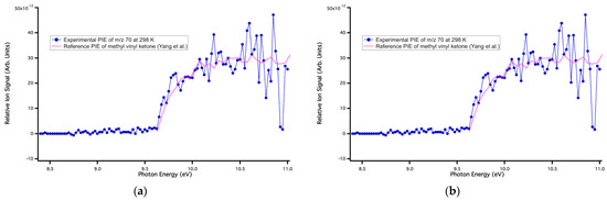 Reference PI spectrum of methyl vinyl ketone superimposed onto the experimental PI spectrum at m/z 70 at (a) 298 K and (b) 550 K.
