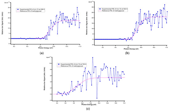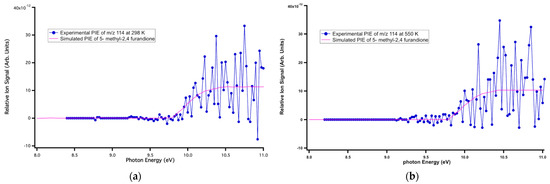 The signal at m/z 42 was assigned to ketene. Its literature PI spectrum reported by Goulay et al. [47] matched well with the experimental data at m/z 42 at all temperatures (Figure 3). The measured ionization energy of 9.56 ± 0.05 eV agreed with the reference adiabatic ionization energy (AIE) of 9.60 ± 0.01 eV [48]. The signal at m/z 44 was assigned to acetaldehyde. The experimental PI spectrum of acetaldehyde matched well with the literature PI curve [38] at all temperatures, as observed in Figure 4, and the measured ionization energy of 10.18 ± 0.05 eV was in good agreement with the literature value of 10.20 ± 0.25 eV [38]. As shown in Figure 5, the reference PI spectra of methyl vinyl ketone reported by Yang et al. [48] agree well with the experimental PI spectra at m/z 70 at all three temperatures. The ion signal starting at ~10.6 eV showed an artificial drop most likely due to an over-background subtraction of a very low signal-to-noise-ratio. The experimental ionization energy of 9.60 ± 0.05 eV matched the reference AIE of 9.62 ± 0.01 eV [47]. The product at m/z 72 was observed at all three temperatures and assigned to methylglyoxal based on the experimental ionization onset’s good agreement at 9.56 ± 0.01 eV with the literature AIE of 9.60 ± 0.05 eV [49] (Figure 6). The experimental ionization energy of 9.11 ± 0.01 eV matched the literature PI curve of dimethyl glyoxal with an AIE of 9.06 ± 0.05 eV, but because of the low signal-to-noise ratio, its characterization was tentative (Figure 7). The last identified product at 298 and 550 K was at m/z 114 and corresponded to 5-methyl-2,4 furandione. No spectra are available in the literature for this species, and an FC simulation was performed and agreed with the experimental data (Figure 8). The higher portion of this spectrum presented a low signal-to-noise ratio that affected the determination of its branching fraction.
