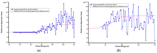 Reference PI spectrum of dimethyl glyoxal superimposed onto the experimental PI spectrum at m/z 86 at (a) 550 K and (b) 700 K.