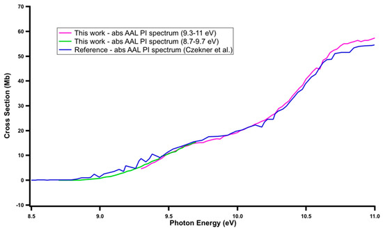 Absolute literature PI spectrum of AAL (blue line) superimposed onto the experimental PI curve (pink and green line) collected at 298 K.