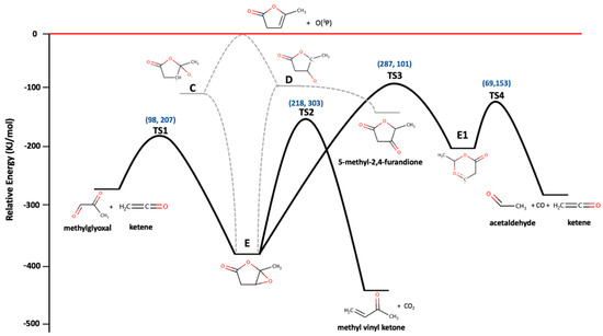 In these experiments, the only observed pathway yielding the formation of the products was O(3P) addition to the unsaturated carbons. The hydrogen abstraction pathway by atomic oxygen is kinetically unfavorable because it proceeds via an energy barrier [44,45]. All primary products originated from intersystem crossing from the triplet to the singlet surface, i.e., from the initial diradicals C and D to the epoxide E and from the diradical D to dimethyl glyoxal and 5-methyl-2,4-furandione (Scheme 1). The values in parentheses represent the energy barriers from both directions of the transition state (TS). The AAL + O(3P) reaction was used as a reference point (the zero-energy level) to calculate the identified primary products’ energy. In the potential energy surface diagram (Figure 10), any molecular species and energetic barrier above the red line is kinetically unfavorable. The AAL oxidation reaction began with two possible triplet diradicals (C and D), which through intersystem crossing, formed the singlet epoxide (E). This species was not observed, because its cation is computed to be unbound using the CBS–QB3 composite model. From the epoxide, four products formed, which were ketene, acetaldehyde, methyl vinyl ketone, and methylglyoxal. Figure 10 shows that the pathways to the left of epoxide E leads to ketene and methylglyoxal, and the pathways to the right leads to the formation of acetaldehyde, methyl vinyl ketone, and 5-methyl-2,4-furandione.