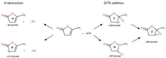 The oxidation of AAL initiated by O(3P) has two possible pathways: oxygen addition to the unsaturated carbons and H abstraction by O(3P). Scheme 1 presents the pathways of the mentioned reaction with the relative energies of two different triplet diradicals (C and D), one singlet epoxide molecule (E), and two doublet radicals from hydrogen abstraction (A and B). The most energetically favorable pathway is O(3P) addition to the most substituted carbon of the double bond, whereas the least energetically favorable pathway is hydrogen abstraction from the ring, due to the stronger C(sp2)–H bond. In general, H abstraction by O(3P) channels is kinetically hindered because of the presence of large barriers [44,45]. As seen in Scheme 1, the diradicals C and D formed from adding the ground-state oxygen atom to the unsaturated carbons. The reaction’s enthalpies (ΔrH) are presented at 0 K. The enthalpy change for the triplet diradical C resulted to be −128 kJ mol−1, and that for the triplet diradical D −107 kJ mol−1. These two triplet diradicals underwent intersystem crossing (ISC) to form the singlet epoxide (E) at −382 kJ mol−1 which led to the several products observed in this work.