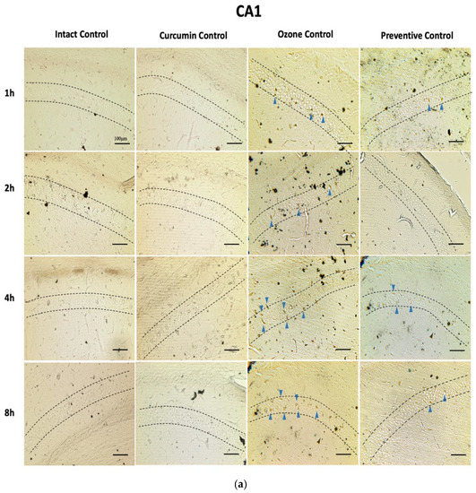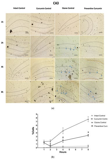 Effect of CUR against hippocampal neurodegeneration after short-term O3 exposure (Table S2). CA3 region was evaluated by a modified silver technique (de Olmos stain). (a) This panel shows representative images of tissue sections at different exposure times in experimental groups (n = 5) showing positive cells (dark brown), indicated with blue arrowheads, dashed lines indicate the CA3 area, (b) The graph illustrates the comparison of the degenerative cell percentage at each exposure time in experimental groups; results are expressed mean values ± SEM and the asterisk indicates a statistical difference between the preventive curcumin and ozone control groups (p < 0.05) at 2, 4, and 8 h. Data of intact control and curcumin control groups are overlapped in the two lines at the bottom.