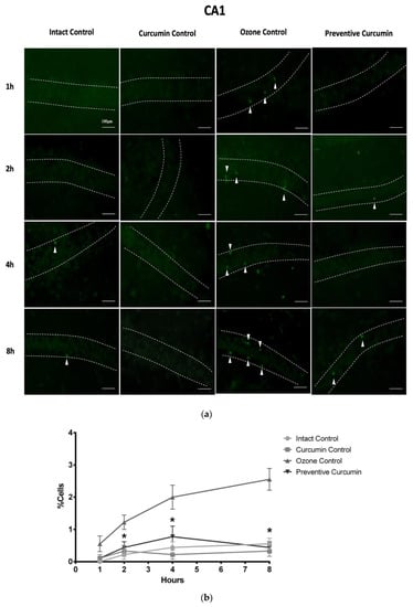 Effect of CUR on hippocampal neurodegeneration after short-term O3 exposure (Table S3). CA1 region was evaluated by the Fluoro-Jade C stain. (a) The panel shows representative images of brain sections at different exposure times in experimental groups (n = 5) showing positive cells (green fluorescence), indicated with white arrowheads, dashed lines indicate the CA1 area. (b) The comparison of the degenerative cell percentage at each exposure time in the experimental groups is shown; results are expressed as mean values ± SE, and the asterisk indicates a statistical difference between the preventive curcumin and ozone control groups (p < 0.05) at 2, 4, and 8 h.