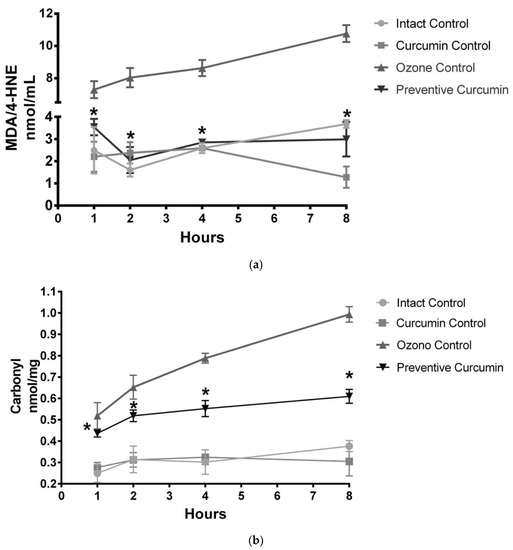 Antioxidant effect of CUR on lipid and protein damage by short-term exposure to O3 (Table S5A,B). (a) Plasma concentration of MDA/4-HNE (nmol/mL) for each experimental group (n = 5). (b) Plasma concentration of carbonylated proteins (nmol/mg) in the experimental groups (n = 5). Data represent the mean value ± SEM, and the asterisk indicates a statistical difference between the preventive curcumin and ozone control groups at all testing times for MDA/4-HNE concentration (p < 0.001) and protein carbonylation (p < 0.001).