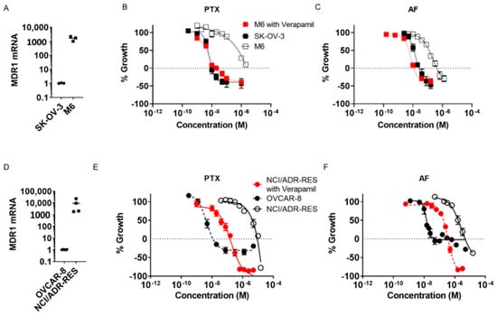 Multidrug resistance (MDR) is a prominent mechanism of resistance to clinically approved therapeutics in ovarian cancer patients [10,30,31]. A major mechanism of MDR is enhanced efflux of drugs, including increased expression of MDR1, which encodes the drug efflux transporter, P-glycoprotein (Pgp). Prior studies have demonstrated that paclitaxel is a Pgp substrate and increased MDR1 expression leads to clinical resistance to taxanes [32]. To determine whether the covalent microtubule stabilizer, taccalonolide AF (Figure 1A), retains efficacy in Pgp-expressing, taxane-resistant ovarian cancer models in vitro, we selected two isogenic cell line pairs that have been reported to express high levels of MDR1. The SK-OV-3-MDR-1-6/6 line is derived from transduction of the parental SK-OV-3 ovarian cancer line with MDR1 [33]. The NCI/ADR-RES cell line was generated by selection for resistance to adriamycin and later found to be a MDR1-expressing derivative of the OVCAR-8 line [34]. Indeed, we found that the SK-OV-3-MDR-1-6/6 and NCI/ADR-RES cell lines, respectively, have 1600 and 9000-fold increased MDR1 expression than their parental cell lines (Figure 2A,D). This level of MDR1 expression is somewhat higher than those observed in a cohort of drug-resistant ovarian cancer patients, which were found to be up to 653-fold higher than the SK-OV-3 cell line [35], suggesting that our choice of cell lines provides stringent models for the evaluation of MDR1-mediated drug resistance in ovarian cancer.
