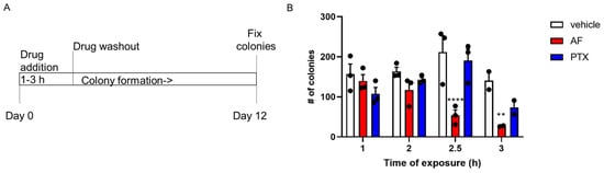 A two-way ANOVA with a Dunnett’s multiple comparisons test was conducted where (drug * time) interaction (F (6, 21) = 3.494, p = 0.0148), time (F(3, 21) = 5.132, p = 0.0081), and drug alone (F(2, 21) = 14.15, p = 0.0001) were observed to have statistical significance (Figure 3B). When drugs were only present for 1–2 h prior to washout, no statistical difference was observed in number of colonies between control and PTX treated groups (p = 0.1888 and p = 0.7061) or between control and AF treated groups (p = 0.7860 and p = 0.2239) (Figure 3B and Figure S1). However, when the duration of drug treatment was increased to 2.5–3 h, AF caused a statistically significant reduction in number of colonies as compared to control (p < 0.0001 and p = 0.0098). In contrast, there was no statistical difference between PTX treated and control conditions (p = 0.6986 and p = 0.1400) (Figure 3B and Figure S1). Together, these data demonstrate that taccalonolide AF has advantages over paclitaxel even in ovarian cancer cells that are equivalently sensitive to both paclitaxel and AF in traditional antiproliferative assays. The long-term, highly persistent inhibition of colony formation by AF over a 12 day period after drug washout after only 2–3 h of acute drug treatment are likely a result of their irreversible target engagement. These findings are important as previous studies have associated in vitro cellular persistence with in vivo efficacy and even used this criteria in the selection of an optimal clinical candidate in the case of the microtubule destabilizer, eribulin [51].