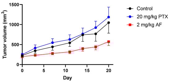 Antitumor efficacy of taccalonolide AF against the NCI/ADR-RES flank xenograft model. Animals were dosed on days 0 and 4 with 20 mg/kg PTX, or 2 mg/kg AF on days 0, 4, and 7 via i.p. injection as compared to untreated control tumors. Control (n = 9), PTX (n = 7), taccalonolide AF (n = 9). Comparison of each of the treatments with control and with each other by two-way ANOVA showed a statistically significant treatment * day interaction for taccalonolide AF vs. control (F (6, 96) = 2.68, p = 0.019) and for taccalonolide AF vs. paclitaxel (F (6, 84) = 5.67, p < 0.0001), but not for paclitaxel vs. control (F (6, 84) = 0.1913, p = 0.98).