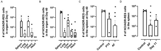 Taccalonolide AF reduces spleen micrometastases in a disseminated ovarian cancer xenograft model. (A) Quantification of NCI/ADR-RES cells in organs of animals 11 days after cell injections (n = 2–3 mice). (B) Quantification of NCI/ADR-RES cells in organs of animals 40 days after cell injections (n = 5 mice). (C) Quantification of NCI/ADR-RES cells in the spleens of animals treated with 20 mg/kg PTX, 1.5 mg/kg AF or vehicle on day 11 and harvested on day 40 (n = 5 mice). (D) Quantification of NCI/ADR-RES cells in the spleens of animals at the time of AF treatment (day 11) or with AF or vehicle at day 40. Closed circles represent individual data points. Statistical significance determined by one-way ANOVA with Dunnett’s (5C) or Tukey’s (5D) post hoc test for multiple comparisons and significant differences as compared to vehicle control are shown. * p < 0.05.