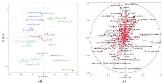 The score and loading plots obtained by the principal component analysis (PCA), performed on the complete chemical compositions of the EOs extracted from all the analyzed hemp samples, is reported in Figure 2a,b, respectively.