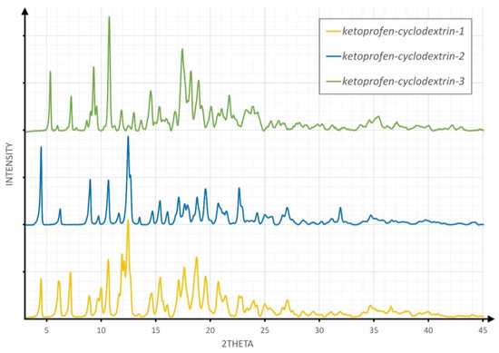 The inspection of Figure 2, Figure 3 and Figure 4 led to the conclusion that the diffraction patterns shown on the bottom of Figure 2 and Figure 4 differ substantially from the diffraction patterns of both KP and β-CD, which might suggest an inclusion complex formation. However, both powders are different from each other, as shown in Figure 1. The diffraction pattern shown in Figure 3 (pale blue drawing) probably represents a physical mixture of both components, as all diffraction maxima shown in the blue pattern are observed in either the grey (β-CD) or violet (KP) diffractogram.
