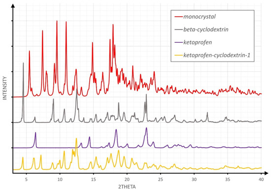 Figure 2, Figure 3 and Figure 4 overlay the diffraction patterns of KP, β-CD, and the corresponding product designated as KP-CD-X, in which X is 1–3, respectively, corresponding to the given method of experimental preparation of the complexes. Each diffraction pattern was subjected to the standard procedure of smoothing and background subtraction. Additionally, the upper part of the figures shows the powder diffraction pattern calculated for the single-crystal structure of the complex.