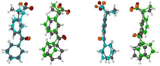 Two views of ketoprofen (KP) conformations of molecules A (blue) and B (green) observed in the crystal structure. The less occupied conformations (C,D, respectively) are shown in grey. Oxygen atoms in molecules A and B are shown in orange. All non-H atoms are shown as 50% probability ellipsoids.