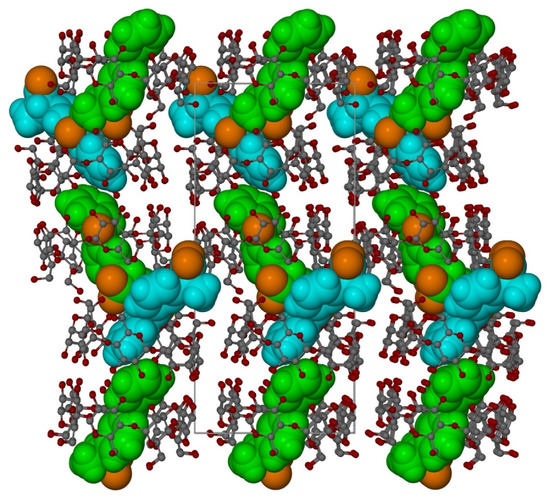 Due to the lack of data for refinement of all parameters for such a large organic structure at once, several additional procedures in the refinement process were implemented (details are presented in the Supplementary Materials). In the final stages of structure refinement, all positional and anisotropic displacement parameters for all non-H atoms were applied; whereas, for the H atoms, which positions were located using standard geometrical criteria, isotropic temperature factors tied with equivalent isotropic displacement parameters of heavy atoms to which they are bonded to were used. The unit cell dimensions of this crystal and the final refinement parameters are presented in Table 1. Some figures in this work were prepared as autostereograms [40] of the crystal structure to allow the visualisation of flat images with a three-dimensional perspective. The X-Seed and POV-Ray software [37,41] have been used for this purpose.