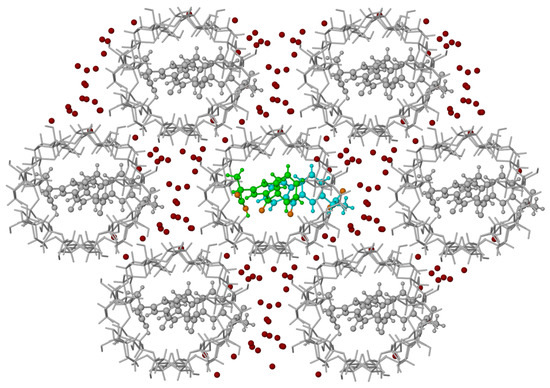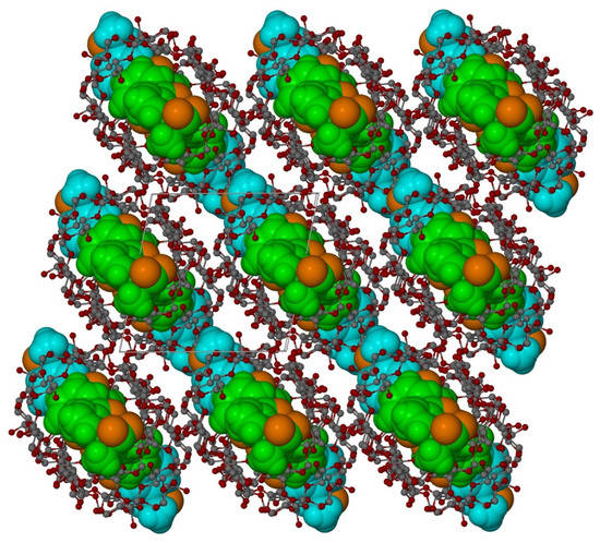 Each β-CD channel is surrounded by six additional channels. The direction of the channels is approximately in the b-direction of the crystal (Figure 7, Figure 8, and Figure S3). Both host and guest (KP) molecules have both hydrophilic and hydrophobic areas. The expected channel structure, formed by β-CD molecules has a hydrophilic exterior and, therefore, spaces between the neighbouring channels are filled with water molecules bonded to β-CD molecules via hydrogen bonds (Figure 8). There are also hydrogen bonds connecting β-CD molecules directly to each other, without the participation of water molecules. In contrast, the interior of β-CD molecules is hydrophobic and, therefore, the hydrophobic guest parts connect with these areas, whereas the hydrophilic guest areas remain outside. In spaces between channels, there are molecules of water that join channels together by hydrogen interactions linking the hydroxyl group of β-CD molecules of the neighbouring channels. There are 22 molecules of water in the independent part of the unit cell (Figure 8). In Figure 8, the central aggregate (two β-CD molecules filled with two KP) shown in full colour is surrounded by a water layer and six similar aggregates (shown in grey).