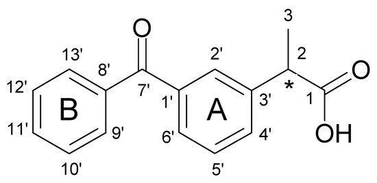 Recently, enantiodiscrimination of KP enantiomers was performed by Obaid et al. [24], who revealed that the (R)- and (S)-KP enantiomers form inclusion complexes with β-CD in an aqueous solution, and chiral discrimination can be achieved at a neutral pH. For this purpose, spectroscopic techniques (UV, FIR, and Raman) were used. The stoichiometry ratio of 1:1 of the inclusion complexes for both enantiomers were calculated, and values of the binding constants indicated that β-CD form inclusion complexes more preferentially with (R)-KP than (S)-KP [24]. Currently, there are over 50 different active pharmaceutical ingredients on the market in various types of CD combination formulations, including NSAIDs [26]. The first pharmaceutical product in the form of a prostaglandin E2 complex with β-CD was introduced in Japan in 1976 by the company Ono Pharmaceuticals Co. as Prostarmon ETM sublingual tablets. In the USA, the first approved product was Sporanox® (itraconazole/2-HP-β-CD) in 1997, and in Europe, the first pharmaceutical product in the form of a complex with CD was piroxicam/β-CD, with the trade name Brexin®, in 1998 [27], later available under other trade names, such as Cicladon and Flogene. Others include nimesulide/β-CD (Mesulid Fast, Nimedex), diclofenac Na/HP-β-CD (Voltaren Ophtha), ibuprofen/β-cyclodextrin (IBU/β-CD) [28], and indomethacin with both β-CD and HP-β-CD (Indocid) [29].