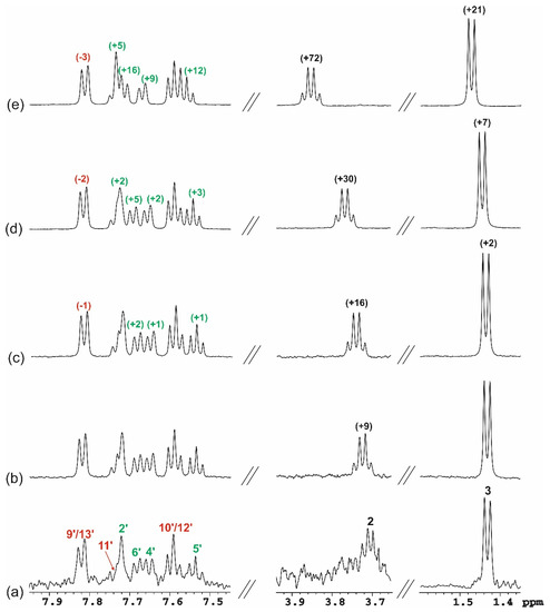 The aromatic (7.40–8.00 ppm) and aliphatic (3.65–3.95 ppm and 1.35–1.60 ppm) fragments of the 1H NMR spectra of racemic KP aqueous solutions: CKP = 0.001 mM (a), CKP = 0.050 mM (b), CKP = 0.100 mM (c), CKP = 0.340 mM (d), CKP = 0.500 mM (e); in brackets. Δδ are given (Δδ = δobs − δ0 is the chemical shift change of proton signals of KP, δobs = the chemical shift of proton signals of KP at given concentration, δ0 = the chemical shift of proton signals of KP at 0.001 mM; positive values indicate high-frequency shifts, [Hz]); chemical shift changes of proton signals of aromatic rings A and B are marked in green and red, respectively; temperature of 25 °C.