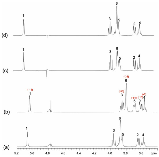 Obviously, when the CD concentration increases, the observed chemical shift changes of the guest proton signals are greater. For example, low-frequency shifts observed for H6′ proton was −116 Hz for sample 1 (Figure 11c), compared to −72 Hz for sample 3 (Figure 11b).