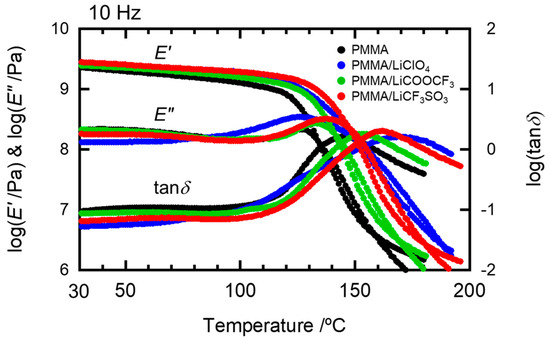 We examined the dynamic mechanical spectra of the PMMA sheets doped with several lithium salts with large anions: LiCF3SO3, LiCOOCF3, and LiClO4. These lithium salts have been used as typical fillers for lithium electrolytes. The resulting dynamic mechanical properties of these samples for temperatures in the 30–200 °C range and salt content of 7 mol% are shown in Figure 1. In addition, the Tg values of the PMMA matrix, estimated from the peak temperature of the E” curve, are summarized in Table 1. The Tg values measured at 10 Hz were different from previous differential scanning calorimetry (DSC) data [18,19] but showed similar behavior as DSC. This difference in values is because the DSC data results from the heat capacity changes under the glass transition, whereas the dynamic mechanical data are associated with the mechanical relaxation due to molecular motion and depend on the mechanical frequency. These data indicate that doping with lithium salts increases the Tg values of the PMMA matrix. It is likely that the obvious increase in Tg is caused by the molecular interaction between the lithium cations and ester groups in PMMA. This is because the molecular interactions between the cations and ester groups in the present PMMA/salt samples were confirmed by the ATR spectra for wavenumbers in the 1650–1780 cm−1 range, as shown in Figure S2.