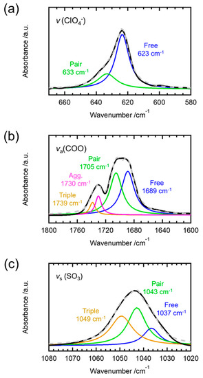 In Figure 2a, the stretching vibration modes of ClO4 are separated, yielding the peaks at 623 cm−1 and 635 cm−1, corresponding to the free anions and bound or contact ClO4− anions [21,22], respectively. Figure 2b shows the peak deconvolution of the ATR spectra of the PMMA/LiCOOCF3 sample with the added salt at 7 mol%. Here, we removed the pristine PMMA spectrum from the ATR spectrum of its doped spectrum because the bands ascribed to the anions in the 1700 cm−1 band overlapped with the carbonyl symmetric stretching vibration mode of pristine PMMA at 1724 cm−1. According to Regis et al. [23], the asymmetric stretching vibration band of COO− is composed of four modes, at 1695 cm−1 (free ions), 1736 cm−1 (triplet anions), 1710 cm−1 (ion pairs), and 1729 cm−1 (aggregates). Figure 2c shows the peak decomposed ATR spectra of PMMA/LiCF3SO3 with 7 mol% of the added salt. In addition, we removed the PMMA spectra from the ATR spectra of the doped samples because the PMMA peaks for wavenumbers in the 1020–1080 cm−1 range overlapped. The symmetric stretching vibration mode of SO3− is composed of three modes at 1032 cm−1 (free ions), 1040 cm−1 (ion pairs), and 1045 cm−1 (triplet anions) [24]. The contributions of the different anionic species (ClO4−, CF3SO3−, and COOCF3−) were quantitatively estimated from the peak areas of the decomposed spectra (Table 2).