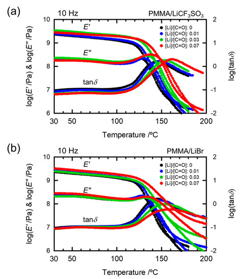 In light of the above, we investigated the additive effects of lithium salts on the glass transition behavior of PMMA, based on the intermolecular interaction between the ester groups of the PMMA side chains [16] and the added lithium salts [17,18,19]. To date, we have succeeded in reducing the birefringence [17] and improving the heat resistance [18] of transparent plastics by adding lithium salts to PMMA and utilizing the intermolecular interaction between the polar groups of PMMA and the added salts. The objective of this work was to clarify the relationship between the salt aggregation structure and the molecular mobility of PMMA chains in PMMA/salt-doped systems. For this purpose, we investigated the additive effects of lithium salts with various anions on the dynamic mechanical spectra of the hosting PMMA matrix.