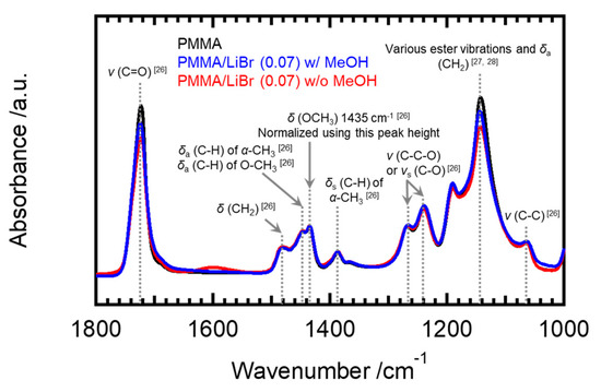 ATR spectra normalized to the peak height at the wavenumber of 1435 cm−1, for PMMA (black), PMMA/LiBr after rinsing with methanol (blue), and PMMA/LiBr (red), for wavenumbers in the 1000–1800 cm−1 range. Their concentrations of LiBr are [Li]/[C=O] = 0.07.