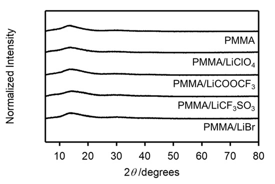 We investigated the effects of the anion sizes of the salts on the formation of the salt aggregates by comparing the doping effects of LiCF3SO3 and LiBr on the Tg of the PMMA matrix. As shown in Figure 8, there are also no significant peaks derived from the salt in the XRD pattern of PMMA doped with LiBr. Figure 4 shows the temperature dependence of the dynamic mechanical spectra, tanδ, for the PMMA/LiCF3SO3 and PMMA/LiBr samples for [Li]/[C=O] in the 0–7 mol% range. The Tg values of PMMA/LiCF3SO3 monotonously shifted toward higher temperatures with increasing salt concentrations. This behavior was also observed for the LiCOOCF3 and LiClO4 doped samples. On the other hand, the doping of LiBr broadened the glass-transition peak as the concentration of LiBr increased [18,22].