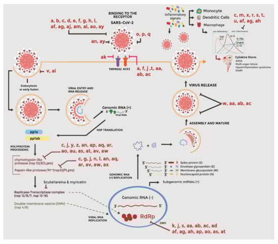 Various active principles and their mechanism of action. The infection cycle of SARS-CoV-2 in human cells. The SARS-CoV-2 spike (S) protein binds to ACE2 in host cells followed by priming of protein S by transmembrane protease serine 2 protease (TMPRSS2). Then, the virus produces the polyproteins pp1a and pp1ab, which are processed by viral proteases (3CLpro/Mpro, PLpro) to non-structural proteins (nsps), including RNA-dependent RNA polymerase (RdRp). Viral RdRp synthesizes a full-length complementary negative-strand RNA as a template for the production of the positive strand genome of the virus. Subgenomic mRNAs are then translated into structural proteins in the rough endoplasmic reticulum or in the cytosol. The viral genomic RNA is encapsulated by the nucleocapsid protein N and, finally, the virus is released by exocytosis. The blunt arrows indicate the possible targets of the active principles of medicinal plants. Irreversibly interference with viral docking receptors: Caphtharic acid (o), cichoric acid and echinacoside from Echinacea purpurea (p), vitamins D, C and Zn (q). Entry locks: Emodin (a), lectins (b), quercetin (c), catechin (d), naringenin (e), hesperetin (f), baicalin (g), epigallocatechin (h), gallocatechin gallate (i), prodelphinidin (af), gallocatechin (ag), saikosaponins derivatives of oleanane from Heteromorpha arborescens and Bupleurum spp. (aj), glycyrrhizine (al), Licorice (am), desmethoxyreserpine (ao), dihydrotanshinone I (ay). ACE2 receptor blocking: Emodin (a), hesperetin (f), kaempferol (j), anthocyanins (t), phenolic compounds: tannic acid (aa), 3-isotheaflavin-3-gallate (ab) and theaflavin-3,3′-digallate (ac) from Camellia sinensis. TMPRSS2 receptor blocking: [6]-gingerol (ak). Block the entry of cells through endocytosis: Butanol extract (v) and procyanidins (ai) from Cinnamomum verum. Inhibit 3CLpro: Quercetin (c), kaempferol (j), curcumin (y), sinigrin (z), eugenol (an), betulinic acid (ap), coumaroyltyramine (aq), cryptotanshinone (ar), desmethoxyreserpine (ao), Dihomo-γ-linolenic acid (au), lignan (as), sugiol (at), N-cis-feruloyltyramine (av), Tanshinone IIa (aw). Inhibit PLpro: Quercetin (c), baicalin (g), kaempferol (j), myricetin (n), scutellarein (l), eugenol (an), coumaroyltyramine (aq), cryptotanshinone (ar), N-cis-feruloyltyramine (av), Tanshinone IIa (aw), moupinamide (ax). Affinity with S protein: Eugenol (an), dihydrotanshinone I (ay). Viral replication: Aescin (k), kaempferol (j), resveratrol (s), prodelphinidin (af), gallocatechin (ag), epigallocatechin isomer (ah) from Pelargonium sidoides, essential oils: β-ocimene, 1,8-cineole, α-pinene and β-pinene (ad), phenolic compounds: tannic acid (aa), 3-isotheaflavin-3-gallate (ab) and theaflavin-3,3′-digallate (ac), betulinic acid (ap), desmethoxyreserpine (ao), lignan (as), sugiol (at). Affects the release or assembly of the virus: Phenolic compounds: tannic acid (aa), 3-isotheaflavin-3-galalate (ab) and theaflavin-3,3′-digallate (ac), lectin agglutinin (w) from Hippeastrum striatum. TNF-β, IL-1β expressions: Quercetin (c), luteoloside (m), chlorogenic acid (x) geranylated flavonoids (tomebrin A, B, D and E) (r), resveratrol (s), anthocyanins (t), gallic acid (u), prodelphinidin (af), gallocatechin (ag), epigallocatechin isomer (ah).