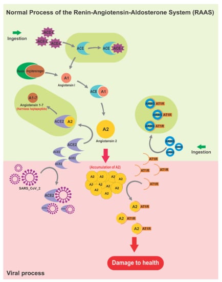 A stressed organism is usually more predisposed to infections by microorganisms []. Frequent or very strong episodes of stress caused by an overactivated RAAS include an excessive conversion of Angiotensin I (AI) into Angiotensin II (AII) by the ACE []. AII binds to the Angiotensin II Type I Receptor (AT1R), causing instability of blood pressure [] as well as cardiovascular, renal [] and prothrombotic issues []; myocardial dysfunction []; altered activity of the sympathetic nervous system []; and chronic hypertension in obese individuals []. AII is considered a cytokine with pro-inflammatory properties and the accumulation of this molecule can induce chemotaxis, contributing to a storm of cytokines [,]. To regulate the over-activated RAAS, ACE2 inactivates AII generating the harmless heptapeptide Angiotensin 1–7 (A1-7) with a powerful vasodilator function []. However, SARS-CoV-2 disrupts this mechanism after hijacking ACE2, causing the accumulation of AII and contributing to various symptoms of COVID-19 []. Therefore, the over-activation of RAAS should be prevented to reduce the severity of the infection []. Specific foods and plants that modulate the RAAS [] can prevent the coronavirus entry or alleviate the COVID-19 symptoms. Figure 2 shows the effect of SARS-CoV-2 on the RAAS.